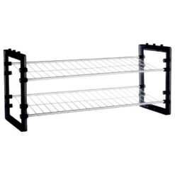 Schoenenrek/schoenenkast stapelbaar zilver/zwart 50 x 65 cm van metaal/kunststof. Dit schoenenrek heeft 2 planken welke u zowel recht als schuin kunt plaatjes en ruimte voor 6 paar schoenen. U dient het rek zelf in elkaar te zetten, bevestigingsmateriaal inbegrepen. Afmeting: ca. 50 x 19 x 65 cm. Materiaal: metaal met kunststof.