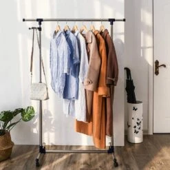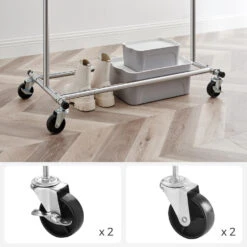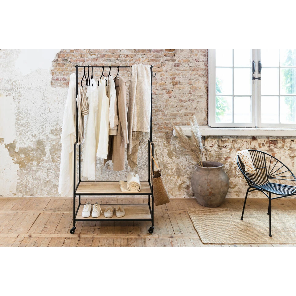Metaal en houten kleding- en schoenenrek: dit rek heeft een stevige metalen constructie en is voorzien van 2 houten planken. Hierdoor kun je een lange tijd genieten van dit kledingrek! Het garderoberek heeft 4 wielen, waardoor het rek makkelijk te verplaatsen is. De wielen hebben ook remmen, hierdoor zal het kledingrek altijd stevig op de grond