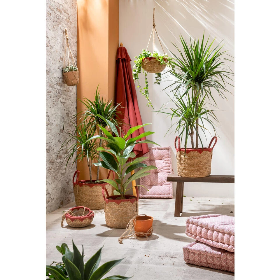 Mand Dille is naturel en rood van kleur en heeft 2 hengels. Door het geweven patroon, is dit een echte eye-catcher voor elk interieur! Berg er spullen in op of decoreer deze leuk met een plaid. Op die manier geef je je interieur net dat beetje extra. De decoratieve mand heeft een afmeting van 45xØ40 cm en is gemaakt van zeegras. Ook verkrijgbaar in de maten 38xØ29 cm en 42xØ34 cm.