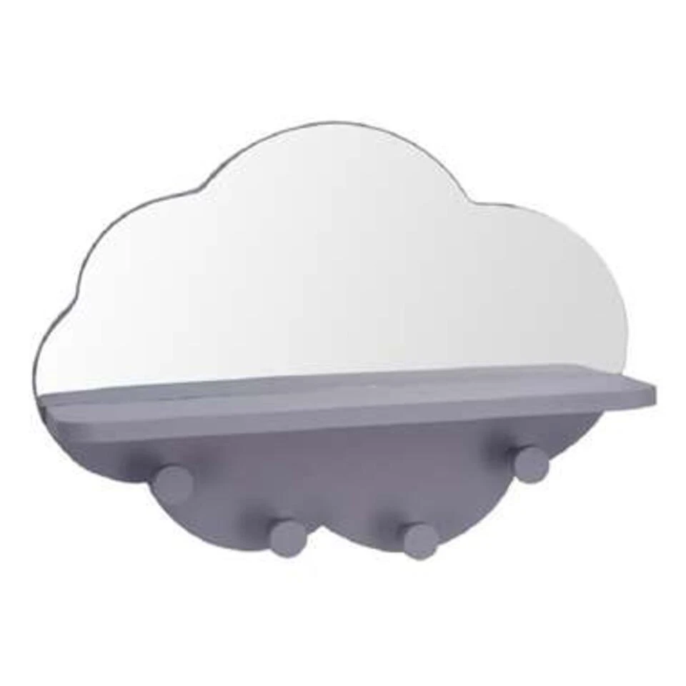 Grijze wolk kapstok met spiegel, voor in de kinderkamer/babykamer. Een leuke kapstok met 4 ronde haken, in de vorm van een wolk. In het midden van de wolk zit een klein plankje, aan de bovenkant een spiegel. De kapstok heeft 2 ophanghaken aan de achterkant waarmee u deze aan de muur kunt ophangen, bevestigingsmateriaal niet inbegrepen.